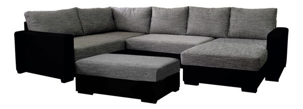Moderná rohová sedačka do tvaru písmena U, sa dokonale hodí do obývacej izby s nadčasovým nábytkom. Je celočalúnená dvomi materiálmi: koženkou a šenilom. Je nerozkladacia, no spací priestor vznikne prisunutím taburetky. Sivá sedacia časť je doplnená o čiernu a čierne plastové nožičky. Šírka operadla (bočnice) je 17,5 cm.