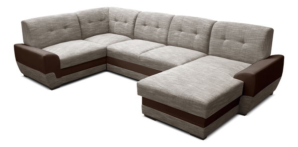 Moderná a priestranná rohová sedačka v tvare do U, ktorá má zaoblené podrúčky a prešívané vankúše v operadlovej časti. Sedačka je potiahnutá koženkou a látkou. V prípade potreby je možné sedačku aj rozložiť a vytvoriť tak plochu na prespanie. Užitočný je aj úložný priestor nachádzajúci sa v otomane sedačky. Pravé prevedenie sedačky.