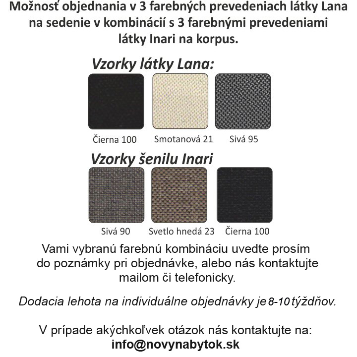 Možnosť individuálnych objednávok v 4 farebných prevedeniach ekokože v kombinácii s 5 farebnými prevedeniami šenilu Berlin. Vzorkovník nájdete v galérii. Dodacia doba pre individuálne farebné prevedenie je 8-10 týždňov. Vami vybranú farebnú kombináciu uvedte prosím do poznámky pri objednávke, alebo nás kontaktujte mailom či telefonicky.