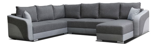 Rozkladacia rohová sedačka Vasto vo vyhotovení pravý roh do písmena U patriaca do sektoru Vasto v prevedení šenil Inari 91 svetlo sivý a šenil Merida 07 tmavo sivá. Sedačka má v balení 7 rozmerných vankúšov, ktoré slúžia ako opierka a 2 malé dekoračné vankúše a je postavená na kovových nožičkách v prevedení chrómová farba.