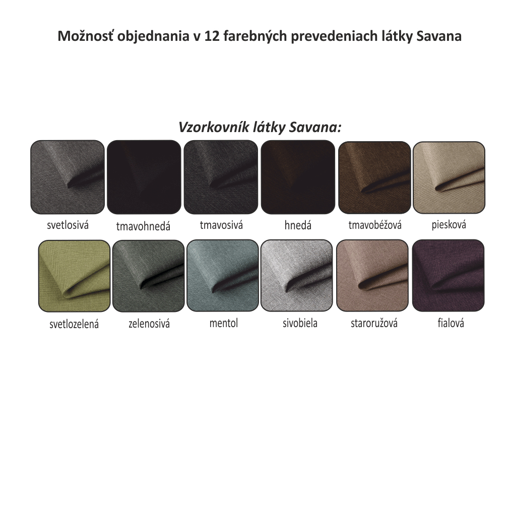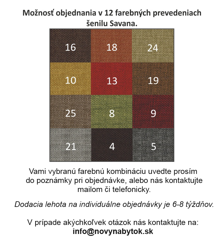 Možnosť individuálnych objednávok v 12 farebných prevedeniach šenilu Savana. Vzorkovník nájdete v galérii. Dodacia doba pre individuálne farebné prevedenie je 6-8 týždňov. Vami vybranú farebnú kombináciu uvedte prosím do poznámky pri objednávke, alebo nás kontaktujte mailom či telefonicky.