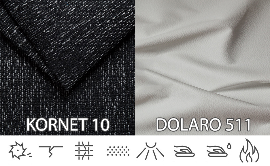 - Kvalitné materiály s vysokou odolnosťou proti oderu (Kornet 40 000 cyklov, Dolaro 120 000 cyklov) zaručujú dlhú životnosť sedačky aj pri každodennom používaní.