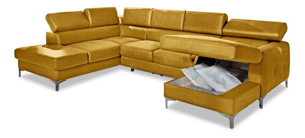 Rohová sedačka v tvare U Sammy (horčicová) (P) výška 74/92 cm hĺbka 207/170 cm Campsbay R456 horčicová farba je pohodlný kúsok nábytku, ktorý Vám umožní relaxovať, príjemne sa posadiť s priateľmi alebo dokonca prenocovať. Tkanina Campsbay R456 v horčicovej farbe dodáva sedačke elegantný vzhľad. Funkcia rozkladu je k dispozícii a plocha spania je 247x125 cm. Sedačka má aj úložný priestor, kde si môžete ukladať rôzne veci. Výška sedadla je 47 cm a hĺbka sedadla je 62 cm. Sedačka má nastaviteľnú opierku hlavy pre väčší komfort. Kovové chrómové nohy dodávajú sedačke moderný vzhľad. Sedačka je dodávaná v demonte a farba tkaniny sa môže líšiť v závislosti od nastavenia monitoru.