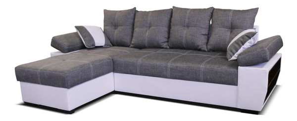 Krásna dizajnová rohová sedačka v prevedení ľavý roh s výrazným prešívaním, ktoré dodáva ucelený tvar. Sedačka je rozkladacia a úložný priestor sa nachádza v rozkladacom rohu, po rozložení sa vytvorí rozmerná plocha na spanie o rozmere 199 cm dĺžka a 143 cm šírka. Sedák je vyrobený z pružiny, čím je zaručený komfort mäkkého sedenia a tvarová trvácnosť sedačky, Na bočnej opierke sa nachádzajú polohovateľné podrúčky , na boku sa nachádza zabudovaná polica. Farebná kombinácia je biela koženka (Bronco 800) a sivá farba šenilu (sawana 05 sivá).