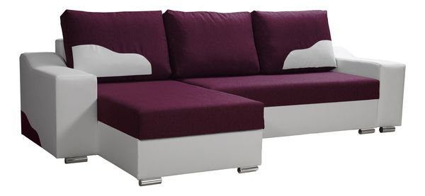 Rohová sedačka Wisteria (fialová + biela) (L) je modernou a luxusnou voľbou pre váš interiér. Táto sedacia súprava obsahuje sedačku s opierkami rúk po bokoch a tri veľké vankúše pre pohodlné opretie sa. Jej farebná aj materiálová kombinácia (tkaná látka a ekokoža) vytvára skvelý dojem. Sedacia súprava disponuje úložným priestorom a je aj rozkladacia, takže vám poskytne viac miesta pre vás a vašich hostí. Rovnako môžete využiť výhody jej nízkych kovových nožičiek. Konštrukcia sedačky je vyrobená z masívneho dreva, drievotriesky v hrúbke 16 mm, drevovláknitej dosky 3 mm a preglejky. Výplňou je polyuretánová pena 28 kg/m³ - T2844. Plocha spania je 200 x 130 cm, výška sedenia 40 cm a výška operadla 50 cm. Tkanina Sawana, ktorá bola použitá na čalúnenie, je ľahká, ale odolná. Tento materiál je skvelou voľbou pre pohovky a postele, s testom oderuvzdornosti Martindale až 45 000 cyklov. Ekokoža Mandarin MA je kvalitnou imitáciou pravej kože, mäkká, flexibilná a farbostála. Jej test oderuvzdornosti Martindale dosahuje až 30 000 cyklov. Sedačka Wisteria je dodávaná v troch balíkoch s celkovou hmotnosťou 125 kg.