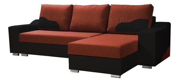 Rohová sedačka Wisteria (oranžová + čierna) (P) s výškou 89 cm a hĺbkou 160 cm vyniká svojou modernou eleganciou a farebným prevedením z kombinácie tkaniny a ekokože. Sedačka je vybavená tromi veľkými vankúšmi pre pohodlné sedenie a opierky na ruky sú veľmi pohodlné. Konštrukcia z masívneho dreva, drevotriesky, drevovláknitej dosky a preglejky zabezpečuje pevnosť a stabilitu. Výplň z polyuretánovej peny s hustotou 28 kg/m³ poskytuje pohodlné sedenie. Sedačka disponuje úložným priestorom a je rozkladacia s plochou spania 200 x 130 cm. Celá konštrukcia stojí na nízkych nožičkách z predného chrómu a zadného plastu. Tkanina Sawana s gramážou 340g/m +/-5 % má jemnú štruktúru a vysokú odolnosť. Tkanina Mandarin MA je kvalitnou imitáciou pravej kože s gramážou 440g/m³. Sedačka je rozdelená do troch balíkov s celkovou hmotnosťou 125 kg.