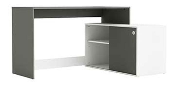 Rohový PC stolík s poličkami a skrinkou s posuvnými dvierkami je vhodný do detskej izby aj kancelárie. Môže byť umiestnený aj v priestore.