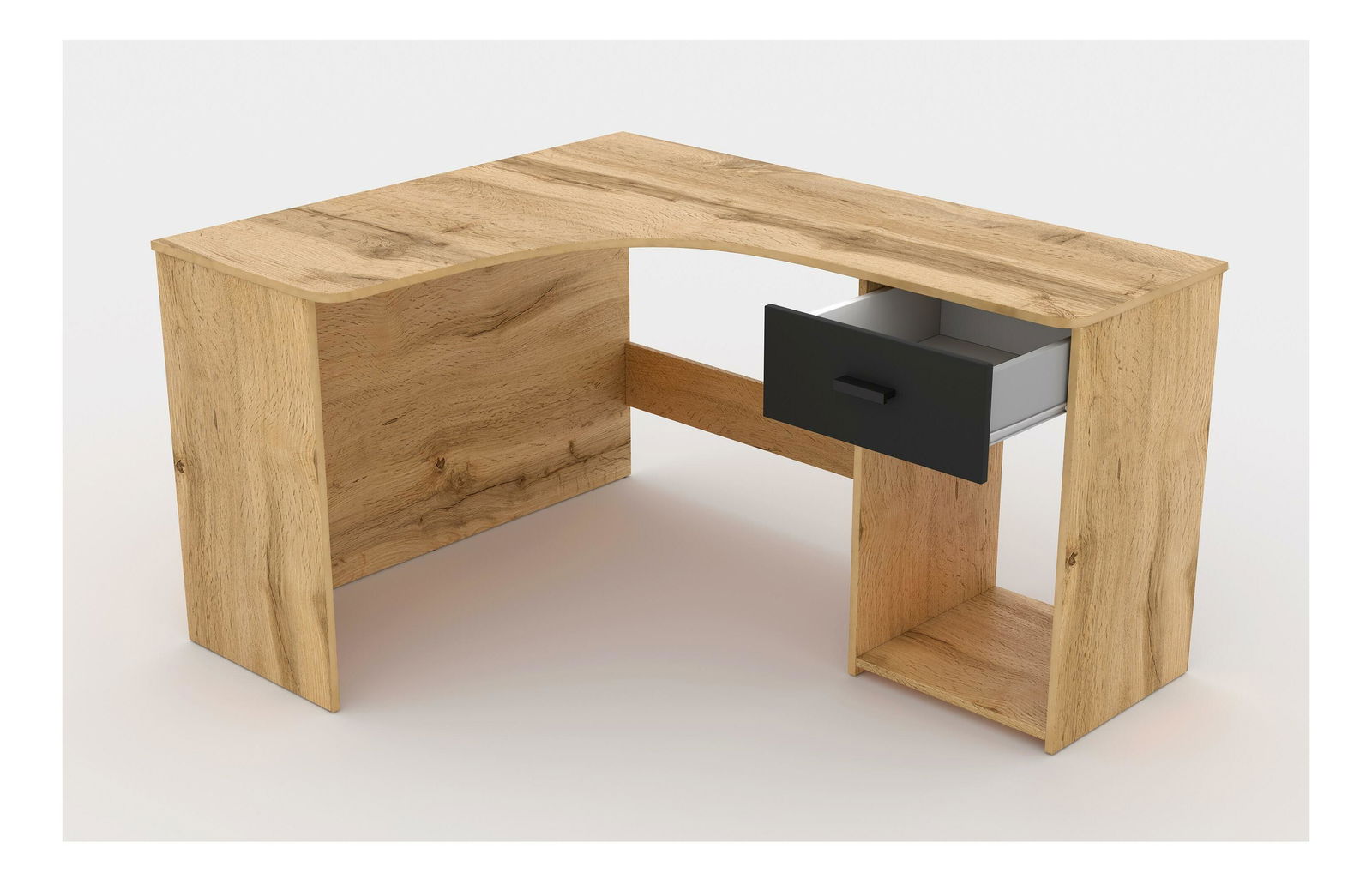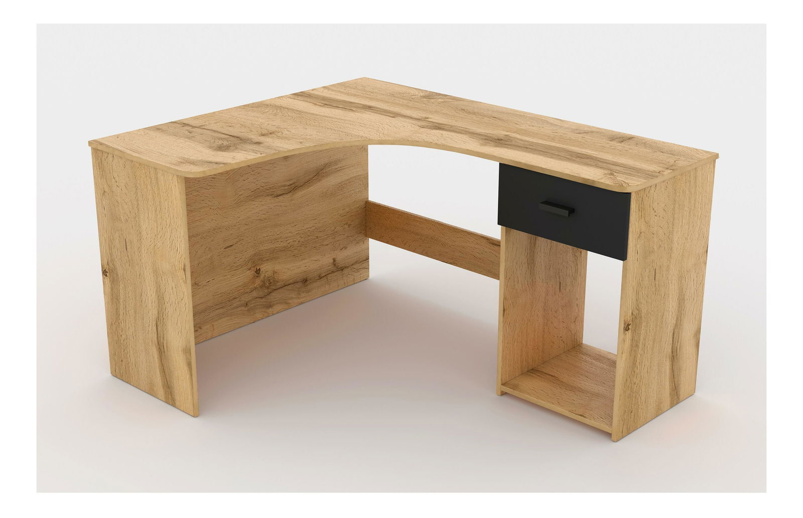 Tento rohový PC stolík je navrhnutý pre efektívne využitie rohových priestorov, čím ponúka maximálnu funkčnosť aj v menších miestnostiach. Vyrobený z laminovanej drevotriesky s hrúbkou 16 mm, stolík zaručuje odolnosť a stabilitu pri každodennom používaní. ABS hrany s hrúbkou 0,6 mm chránia jeho povrch pred poškodením a predlžujú životnosť. Stolík neobsahuje výsuvnú dosku pre klávesnicu, čo mu dodáva kompaktný a čistý dizajn. Disponuje jednou praktickou zásuvkou, ktorá poskytuje úložný priestor na kancelárske potreby, takže váš pracovný priestor zostane organizovaný a uprataný.