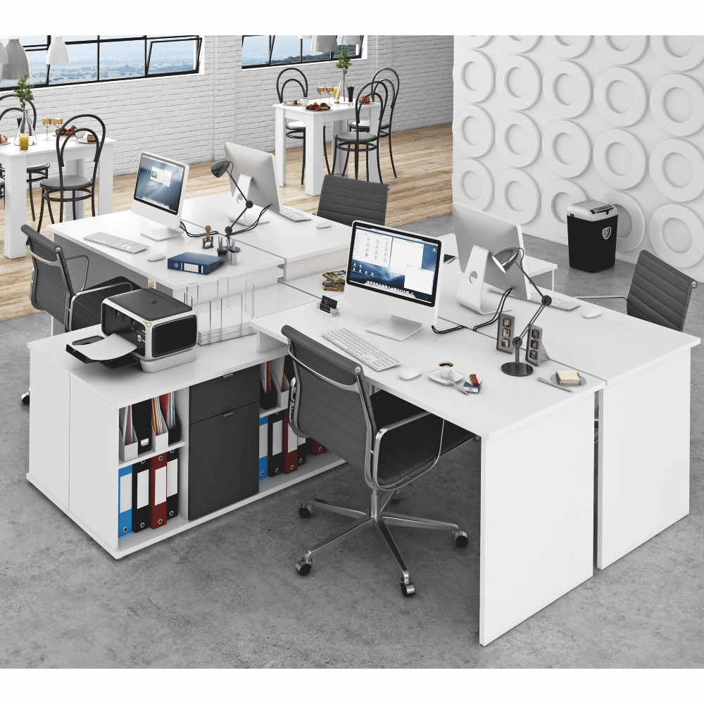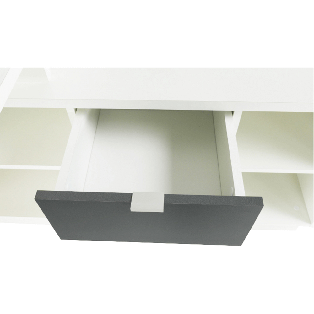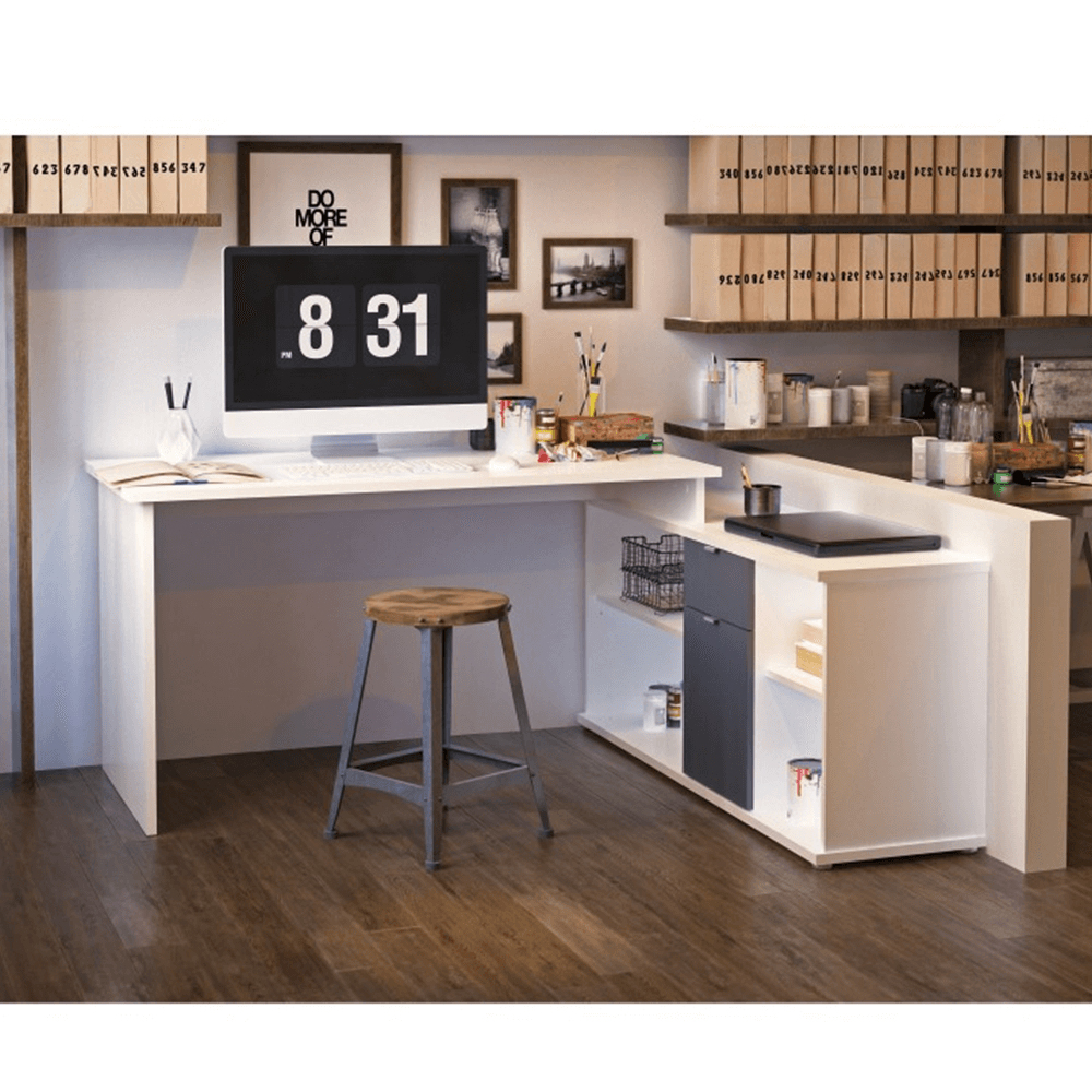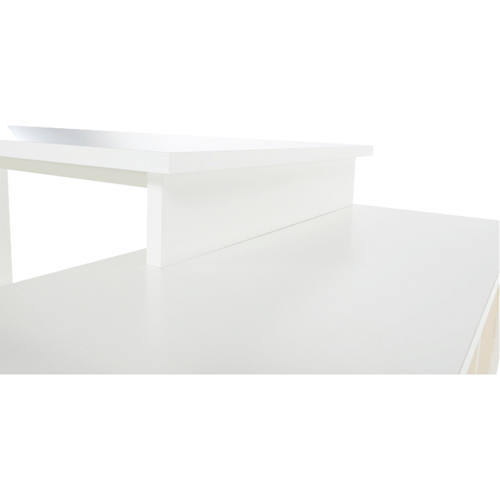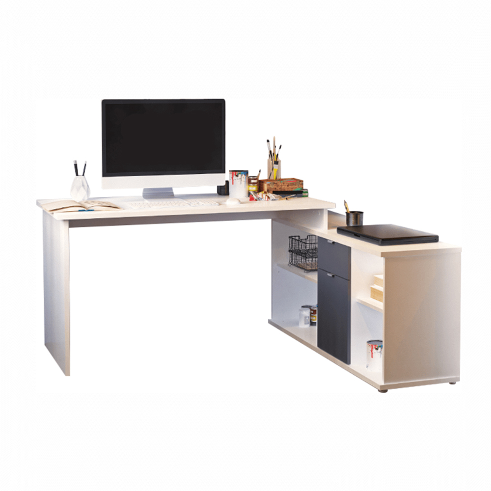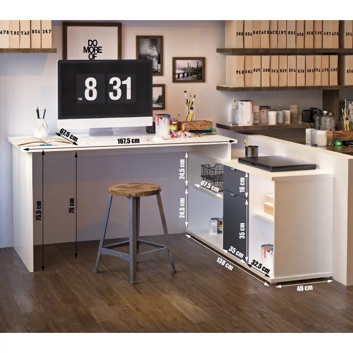 Rohový univerzálny PC stolík Dasys vám poskytne množstvo úložného priestoru. V pravej časti PC stolíka sa nachádzajú otvorené poličky a skrinka so zásuvkou uprostred. Stolík s moderným dizajnom je dodávaný v peknej farebnej kombinácii dub sonoma svetlý a biela.