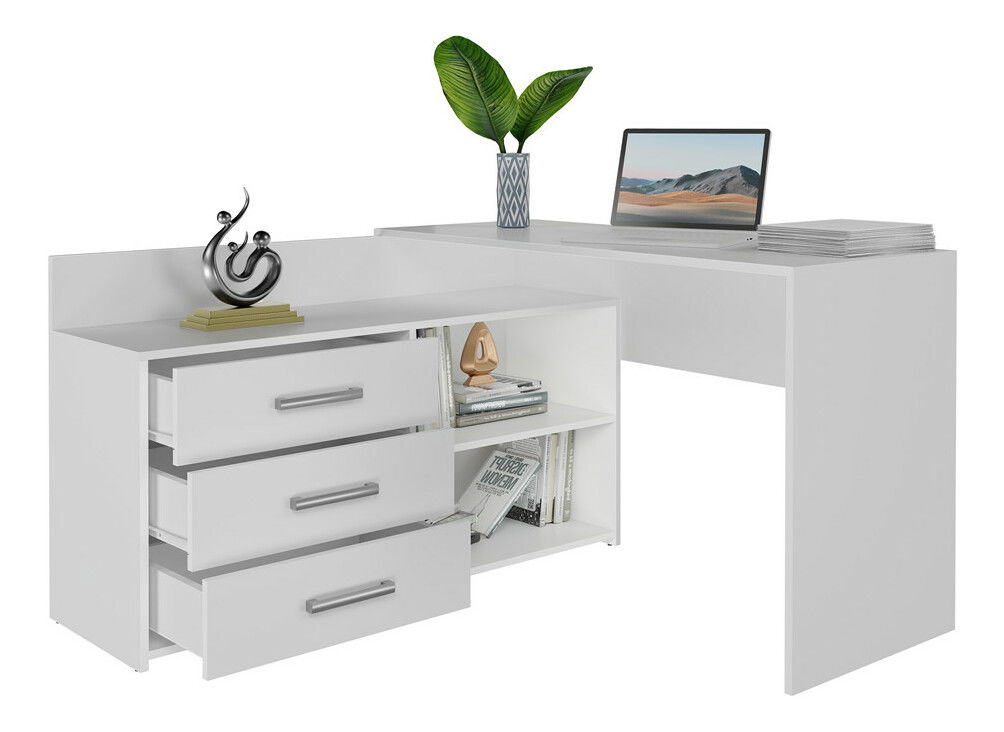 Rohový pc stolík Debio 1 v elegantnej bielej farbe je ideálnym riešením pre každú pracovňu alebo študentský kútik. Jeho dizajn v tvare písmena L efektívne využíva priestor a poskytuje dostatok pracovnej plochy. S tromi priestrannými zásuvkami, ktoré sú umiestnené na kvalitných valčekových vodidlách, ponúka pohodlné a bezpečné uskladnenie dokumentov a kancelárskych potrieb. Tento moderný a funkčný nábytok je vyrobený z laminovanej drevotriesky, čo zabezpečuje jeho odolnosť a jednoduchú údržbu. Debio 1 je skvelou voľbou pre tých, ktorí hľadajú kombináciu štýlu a praktickosti.