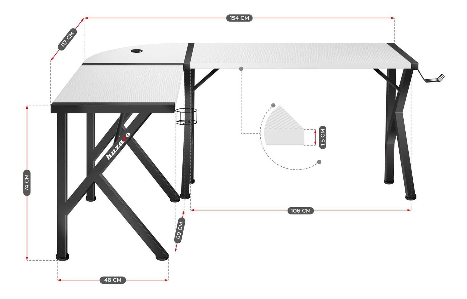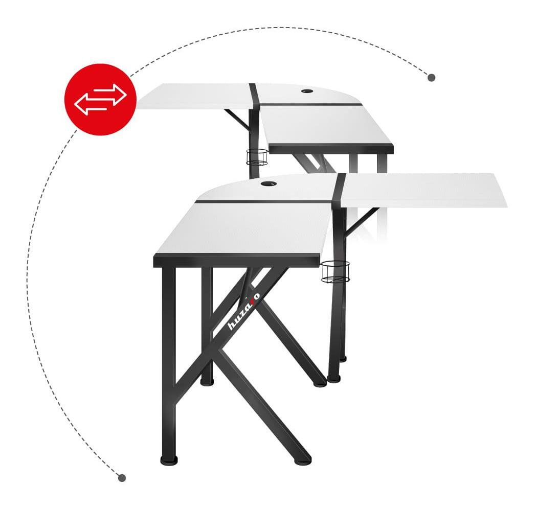 Vďaka špeciálnemu zvršku v tvare L je stôl nielen praktický, ale predovšetkým nastaviteľný. Nábytok bol starostlivo premyslený, aby sa prispôsobil vášmu interiéru. V závislosti od vašich preferencií je možné písací stôl zostaviť dvoma spôsobmi: so širším nadstavcom na ľavej alebo pravej strane. Celý proces je veľmi jednoduchý a návod na použitie vás prevedie. Nie náhodou má pracovná doska charakteristický tvar „L“. Premyslený dizajn zvyšuje množstvo priestoru, ktorý môžeme využiť pri práci alebo štúdiu. Vďaka tomu je všetko vždy po ruke. Doska stola je pokrytá špeciálnym povlakom podobným uhlíku. Ide o mimoriadne praktické riešenie, stolová doska je odolná, odolná voči poškriabaniu a nečistotám a zároveň skvele vyzerá. Stolová doska s hrúbkou 15 mm, vyrobená z odolnej dosky, zaručuje stabilitu aj pri veľmi vysokom tlaku. Stôl má centrálne umiestnený káblový vstup, vďaka ktorému si pohodlne a efektívne usporiadate všetky pripojenia vášho zariadenia. Pohodlný, praktický držiak na slúchadlá. Keď slúchadlá nepoužívate, visia bezpečne bez toho, aby zaberali miesto na vašom stole. Špeciálny, pohodlný držiak na nápoje. Ľahko a bezpečne do nej uložíte plechovky, fľaše a poháre. Držiak pohára znižuje riziko náhodného zaplavenia cenného vybavenia.