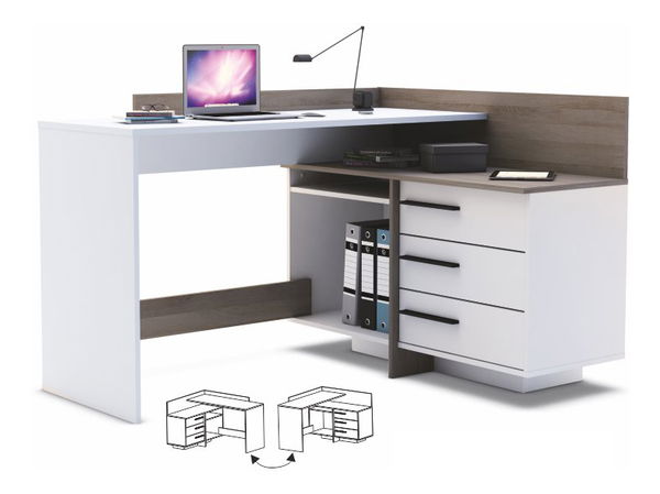 Dizajnový PC stolík s hornou doskou s nohou s variabilným umiestnením. Korpus hlavnej časti stolíka je v bielej farbe, horná a zadná vyčnievajúca doska je v odtieni dub tmavý. V pravej časti sa nachádzajú 3 zásuvky a v ľavej časti je veľká polička a priestor na klávesnicu. Variabilnú hornú dosku v bielom odtieni je možné upevniť do ľavej alebo pravej strany kolmo na hlavnú časť stolíka.