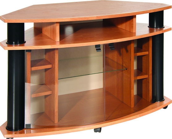 Elegantný TV stolík/skrinka so spodnou základňou na kolieskach. Stolík je vybavený 2 masívnymi čiernymi stĺpmi po stranách. V strede sa nachádza presklená skrinka s dvierkami s čírym sklom vybavená sklenou poličkou a drevenými poličkami po stranách. Pod hornou doskou sa nachádza jedna polička na audio/video zariadenia. Prevedenie dreva je jelša a buk a nožičky sú v čiernej farbe.