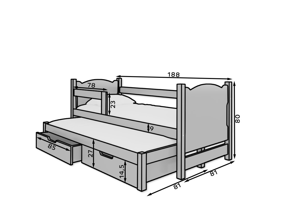 Posteľ CHLOE je skvelým riešením pre deti každého veku. Vyrobená z prírodného borovicového dreva, ktoré pridáva tepla a príjemnej atmosféry do každého interiéru. Posteľ je nielen krásna, ale aj praktická. Obsahuje rošt vyrobený z pružných lamiel v systéme Flex, ktorý zabezpečuje optimálnu podporu a pohodlie počas spánku. S penovým matracom, ktorý má odnímateľný poťah na zips, vytvárajú dokonalú kombináciu pre zdravý a odpočinkový spánok vašich detí. S dvoma úrovňami spania, horným lôžkom s rozmermi 180 x 75 cm a spodným lôžkom s rozmermi 172 x 75 cm, posteľka Chloe poskytuje dostatok miesta pre súrodenca alebo kamaráta. Posteľka obsahuje aj dvojicu vysúvacích zásuviek na gumených kolieskach, ktoré poskytujú dostatok úložného priestoru pre hračky, knihy a iné dôležité veci. Posteľ je vybavená bariérou proti spadnutiu, ktorá zabezpečuje bezpečnosť a pokojné sny vašich detí. Pre vašu pohodu a usporiadanie je postieľka Chloe rozkladacia, takže ju môžete jednoducho upraviť podľa potreby. Produkcia tejto postele používa ekologické vodové farby, ktoré sú bezpečné pre deti a odolné voči mechanickému poškodeniu. Balenie obsahuje príslušenstvo na montáž a montážny návod.