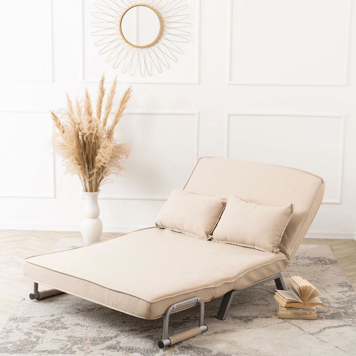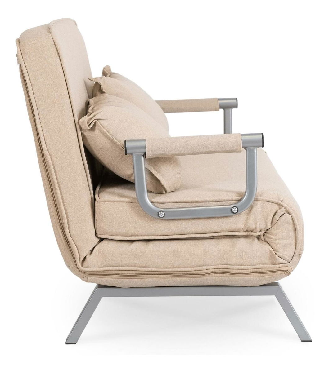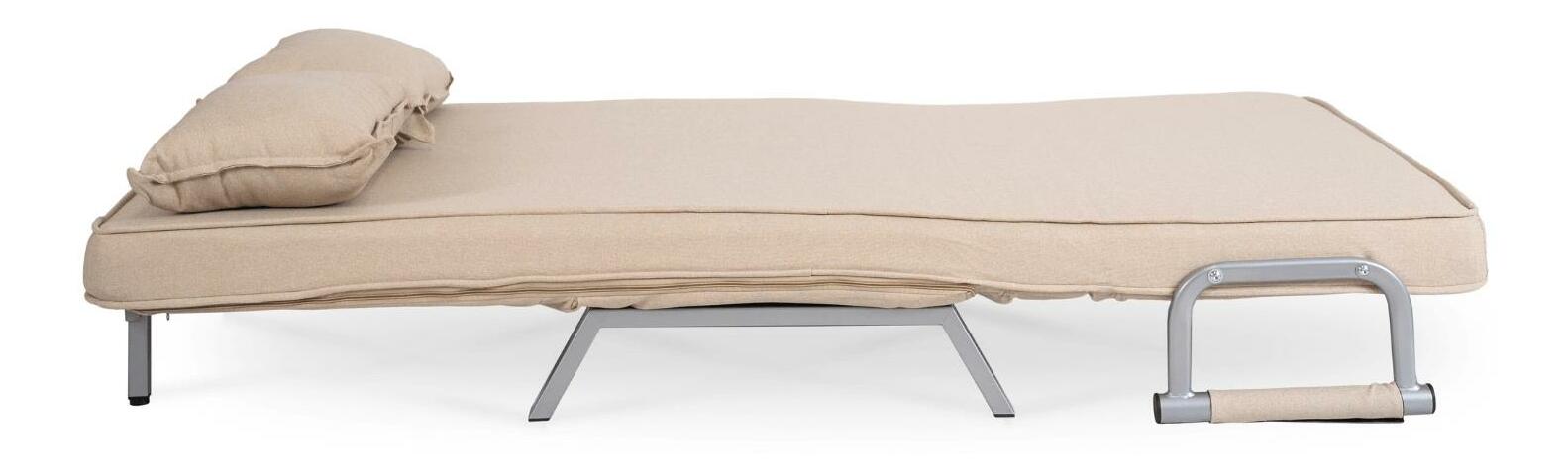 Rozkladacia pohovka Bancarias 2 v jemnej béžovej farbe je riešením pre moderné interiéry, ktoré ocenia kombináciu funkčnosti a pohodlia. Jej kvalitné látkové čalúnenie zaručuje príjemný dotyk a jednoduchú údržbu, zatiaľ čo pevný kovový rám v striebornej farbe dodáva stabilitu a odolnosť s maximálnou nosnosťou až 250 kg. Pohovka disponuje praktickými podrúčkami, opierkou hlavy a opierkou na nohy, ktoré umožňujú maximálny relax počas dňa aj pohodlné prespanie hostí vďaka rozkladacej funkcii.