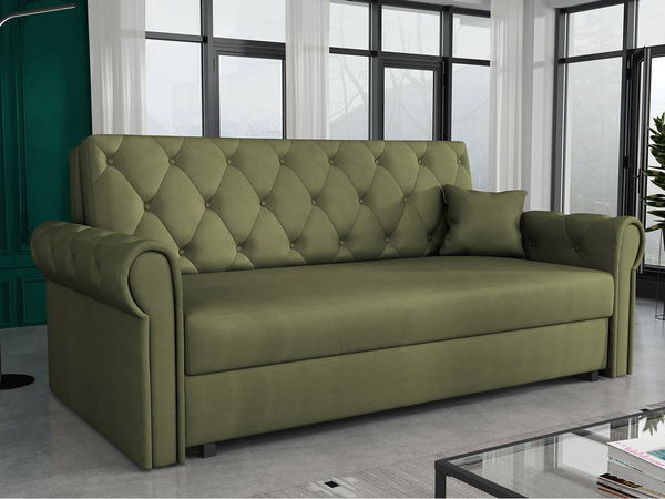 Rozkladacia pohovka Carivia Roma IV v zelenej farbe je riešením pre domácnosti, ktoré hľadajú spojenie komfortu, funkčnosti a štýlu. Jej pevná konštrukcia z borovicového dreva a drevotrieskovej dosky zaručuje dlhú životnosť, zatiaľ čo kvalitné čalúnenie a prešívanie na operadle a podrúčkach dodávajú nábytku charakter. Pohovka je vybavená automatickým rozkladacím mechanizmom typu americana, ktorý umožňuje rýchle a jednoduché premenenie na pohodlné lôžko s rozmermi 196 x 152 cm – vhodné pre hostí alebo každodenné spanie. Pre ešte väčší komfort a praktickosť môžete zvážiť aj rozkladacie sedačky vhodné na každodenné spanie.
