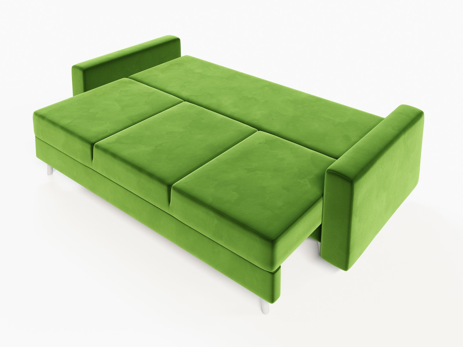 Pohovka je čalúnená kvalitným, ľahko udržiavateľným poťahom, ktorý odoláva bežnému opotrebovaniu, a jej komfort zvyšujú vlnité pružiny spolu s penou, ktoré zabezpečujú príjemné sedenie aj spánok. Pevné drevené nožičky dodávajú stabilitu a zároveň jemne nadvihujú nábytok, čím uľahčujú upratovanie pod ním. Praktickým bonusom je úložný priestor, ktorý poslúži na uskladnenie prikrývok, vankúšov alebo sezónnych doplnkov.