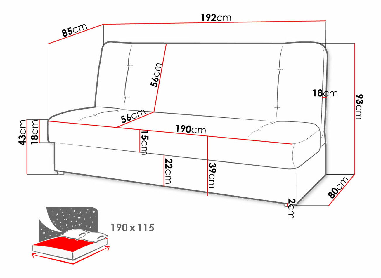 dĺžka: 192 cm, šírka: 85 cm, výška: 93 cm, plocha na spanie: 190 x 115 cm