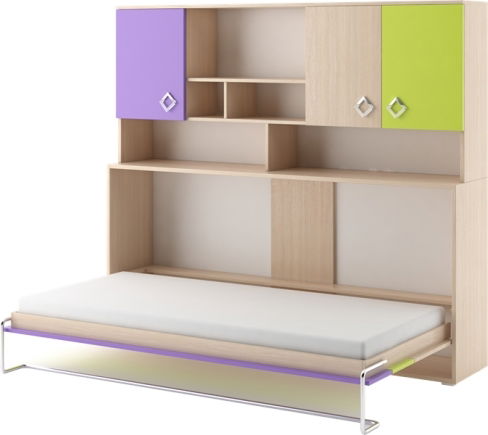 Praktická rozkladacia posteľ umiestená do skrine je svojím špecifickým vyklápacím otváraním preurčená do malých izieb, kde sa po zložení postele vytvorí priestor na hranie. Nad úložným priestorom pre posteľ je množstvo otvorených poličiek a dve skrinky na stranách skrine. Do postele sa používa pružinový matrac v rozmeroch 186cm dĺžka, 80cm šírka a 15cm hrúbka. Decentný lesklý kosoštvorcový úchyt