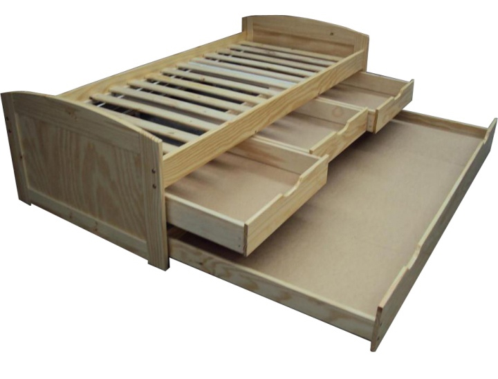 Rozkladacia posteľ s výsuvnou prísteľkou na kolieskach a tromi zásuvkami nad ňou vyrobená prevažne z lakovaného masívu borovice (korpus). Stredná časť a spodná posteľ je z preglejky. Na vrchnej posteli sa nachádza latkový rošt, ktorý je dodávaný s posteľou. Odporúčame dokúpiť matrac.