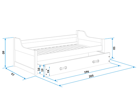Rozkladacia posteľ 90 x 200 cm - BMS Group - Dimar (borovica + modrá) s roštami, matracmi a úložným priestorom je vhodná pre tých, ktorí hľadajú praktické a pohodlné riešenie pre svoje spacie potreby. S výškou 60 cm, šírkou 97 cm a hĺbkou 205 cm, táto posteľ ponúka dostatok priestoru na pohodlný spánok. Rám postele je vyrobený z kvalitného borovicového dreva a lakovaný lakom na vodnej báze, čo zaručuje dlhú životnosť nábytku. Táto posteľ je v súlade s normami TUV z hľadiska kvality a bezpečnosti. S roštami, matracmi a úložným priestorom, táto posteľ je kompletným riešením pre Váš spálni.