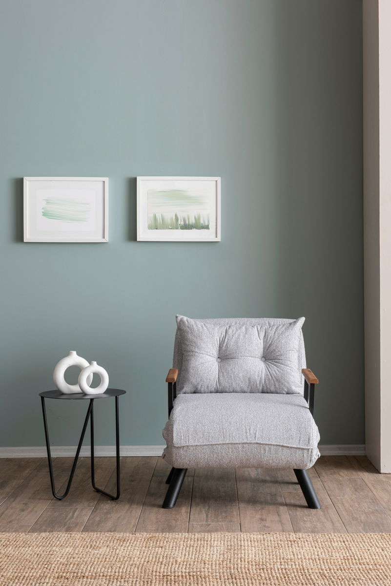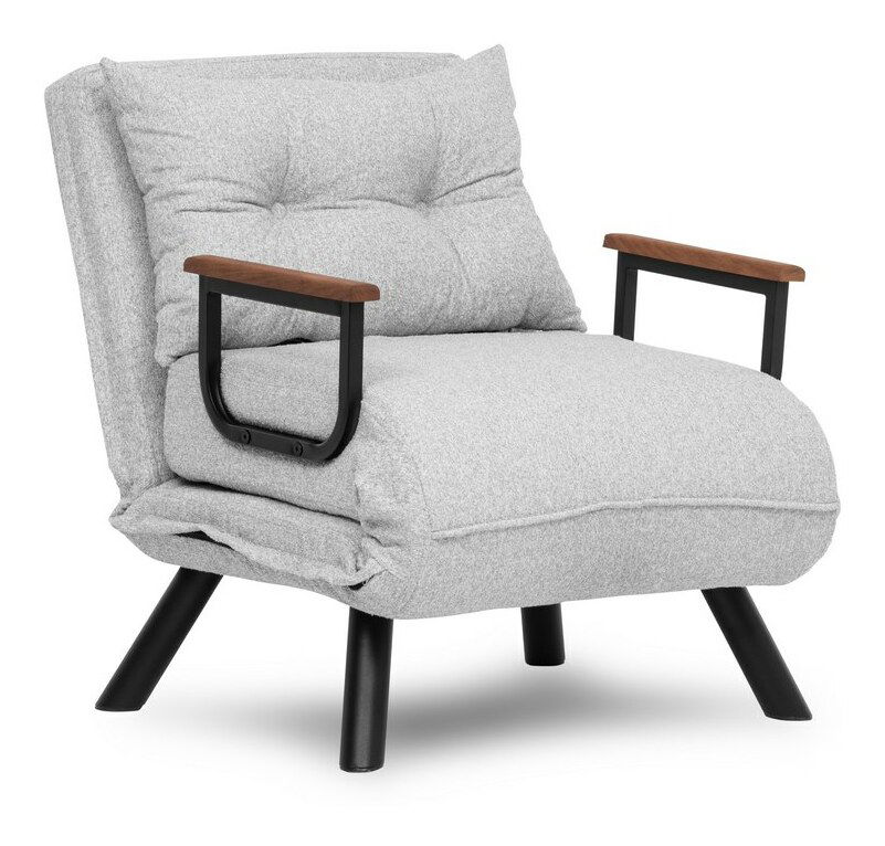Rozkladacie kreslo Sandy v sivej farbe je ideálnym doplnkom do každého moderného interiéru, či už hľadáte praktický nábytok do obývačky alebo útulný prvok do spálne. Jeho nadčasový dizajn kombinuje mäkkú látku s pevným kovovým rámom a drevenými detailmi na opierkach, čo zaručuje odolnosť a vizuálnu príťažlivosť.