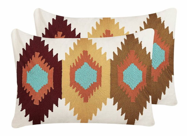 Táto súprava vankúšov je výbornou voľbou do akejkoľvek obývacej izby. Ručne vyrobené bavlnené poťahy s farebným geometrickým vyšívaním doplnia interiér v tradičnom alebo boho štýle. Vankúše majú mäkkú výplň a praktický zips, ktorý uľahčuje čistenie poťahov. Umiestnite ich na posteľ, pohovku alebo kreslo a váš interiér sa okamžite rozžiari krásnymi farbami.