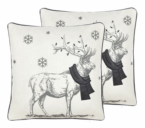 Zvýraznite svoju vianočnú výzdobu pomocou tejto sady dvoch nádherných vankúšov. Sú vyrobené z odolného polyesterového plátna a majú mäkkú výplň pre maximálne pohodlie. Prednú stranu každej obliečky zdobí silueta soba na sivobielom podklade. Okraje vankúšov majú kontrastné lemovanie, ktoré ladí so šálom na zvieratku. Sú skvelým doplnkom každého minimalistického, moderného alebo tradičného prostredia.