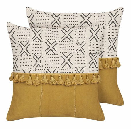 Tieto vankúše sú ideálnym doplnkom pre vašu pohovku alebo posteľ. Kombinácia horčicovožltej látky s ručne vyrábanými strapcami a geometrickým vzorom robí z vankúšov pútavý bytový doplnok. Zvláštnosťou je motív, ktorý bol vyrobený špeciálnou technikou blokovej tlače. Ak hľadáte vankúše, ktoré budú jedinečné a krásne, tak táto súprava bude skvelou voľbou.