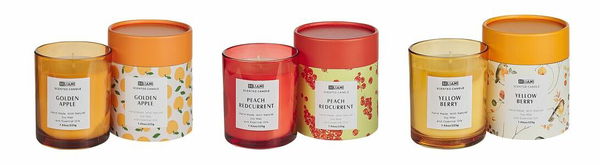 - Sada 3 ks vonných sviečok broskyňa a červená ríbezľa/žlté bobule/jablko Baldomero (žltá)