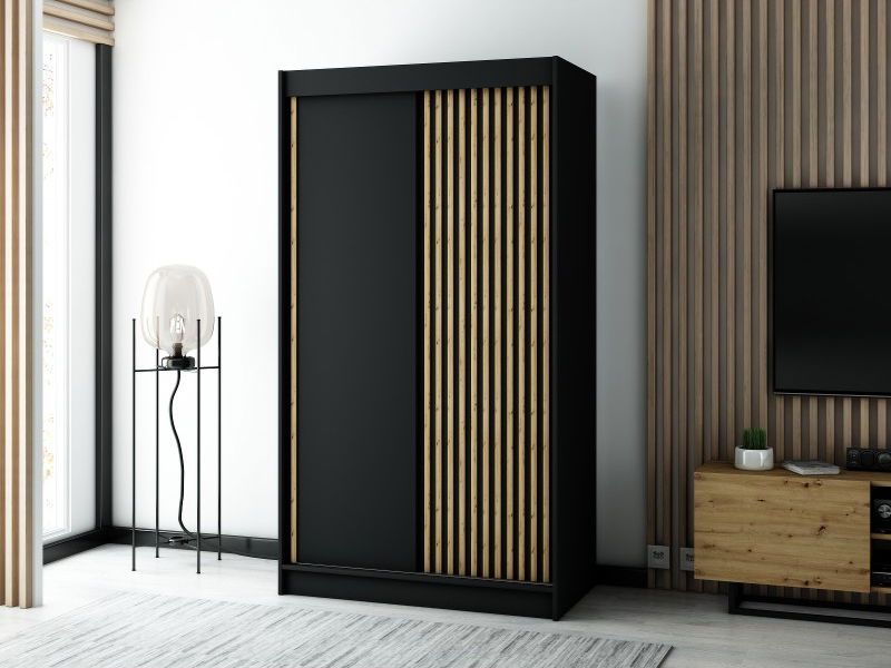 Šatníková skriňa Ladonna s matnými dverami a dizajnovými lamelami je ideálna pre moderné a mladistvé interiéry. Skriňa má jedny posuvné dvere v čiernej matnej farbe a druhé dvere sú vyrobené z laminovanej dosky s lamelami. Bezúchytkový systém otvárania a hliníkové vodidlá zaručujú komfortné a hladké používanie. Šatníková skriňa je vyrobená z kvalitného materiálu, laminovanej dosky s hrúbkou 16 mm a PVC dyhy s hrúbkou 0,5 cm. Posuvný systém je značky BIMAK. Šatníková skriňa je dodávaná v baleniach pre jednoduchú a rýchlu montáž, ktorá je možná aj svojpomocne. V balení nájdete všetky potrebné prvky a montážny návod. Zásuvky sú voliteľným príslušenstvom, ktoré si môžete zakúpiť na našom e-shope. Rozmery skrine sú 120x200x62 cm.
