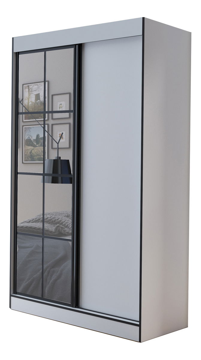 Šatníková skriňa Oklahoma 2 (biela + čierna) s výškou 216 cm a hĺbkou 65 cm je ideálnym riešením pre Vašu spálňu. Skriňa má šírku 120 cm a dvoje posuvné dvere, z ktorých jedny sú zrkadlové. Vnútri skrine sa nachádza vešiaková tyč a poličky na uskladnenie oblečenia. Farebné prevedenie skrine v bielo-čiernom kontraste dodáva izbe moderný vzhľad. Skriňa je vyrobená z kvalitnej drevotriesky s hrúbkou 16 mm a má matné prevedenie a papierové hrany. Skriňa je dodávaná vo 3 balíkoch s hmotnosťou 87 kg. Šatníková skriňa Oklahoma 2 je praktickým a elegantným doplnkom každej spálne.