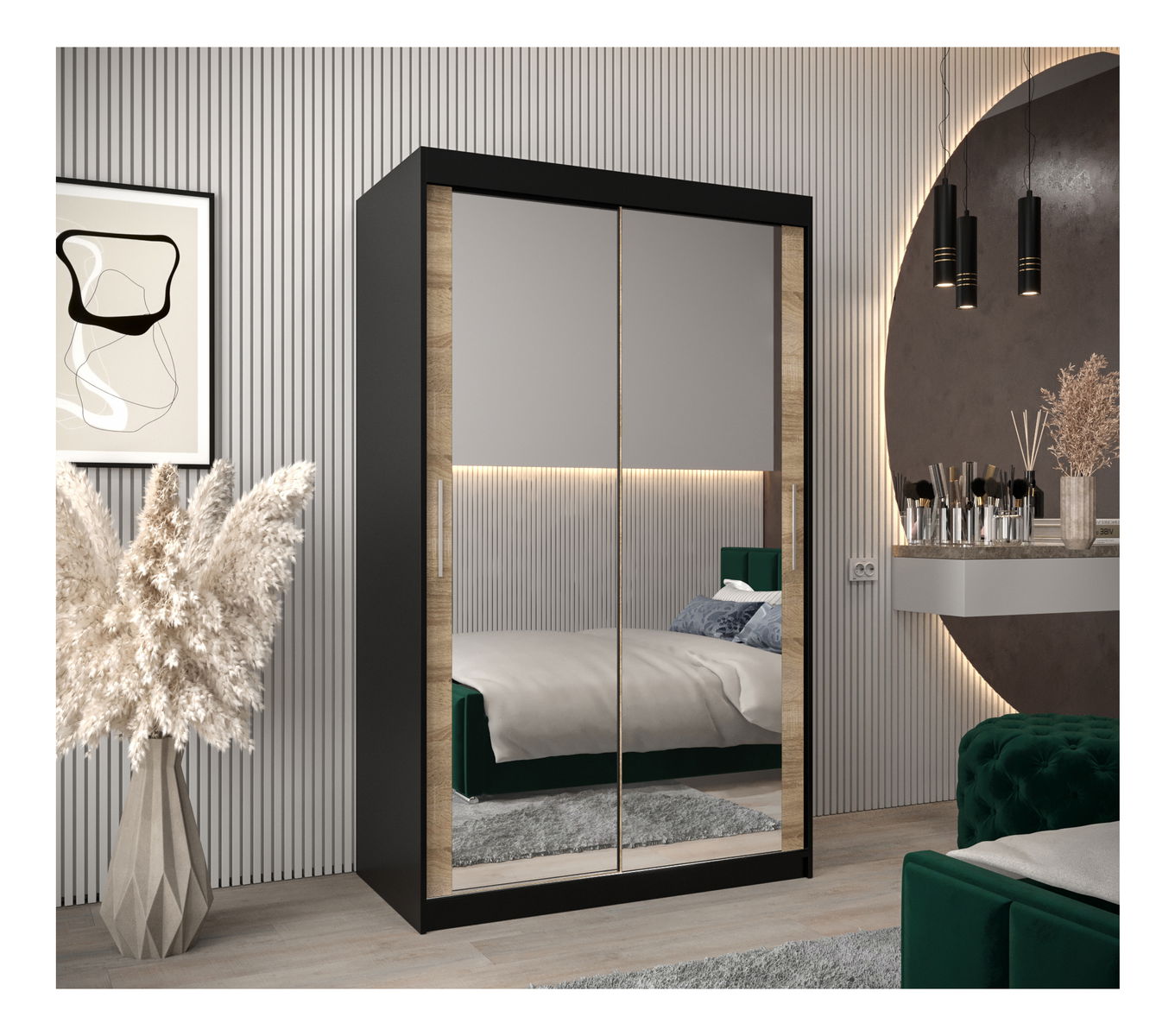 ZobraziťPredstavujeme vám šatníkovú skriňu Toki s posuvnými dverami. Táto skriňa je elegantným a moderným riešením pre ukladanie vecí v súčasnej domácnosti. S výškou 200 cm, šírkou 120 cm a hĺbkou 62 cm, čierna matná + dub sonoma farba tejto skrine je skvelým doplnkom vášho interiéru. Využíva inovatívny posuvný systém LAGUNA, ktorý zabezpečuje jednoduchý prístup k šatníku. Skriňa je vybavená striebornými plastovými úchytkami, ktoré dodávajú minimalistický štýl. Zrkadlové dvere nielenže poskytujú pohodlie, ale aj pridávajú štýlový prvok. Táto skriňa je navrhnutá tak, aby zdvihla váš priestor a spojila praktickosť s minimalistickou estetikou. S Šatníkovou skriňou Toki s posuvnými dverami si jednoducho zorganizujete svoje veci a dodáte izbe nádych modernej elegancie. Nechýba jej ani forma a funkčnosť.