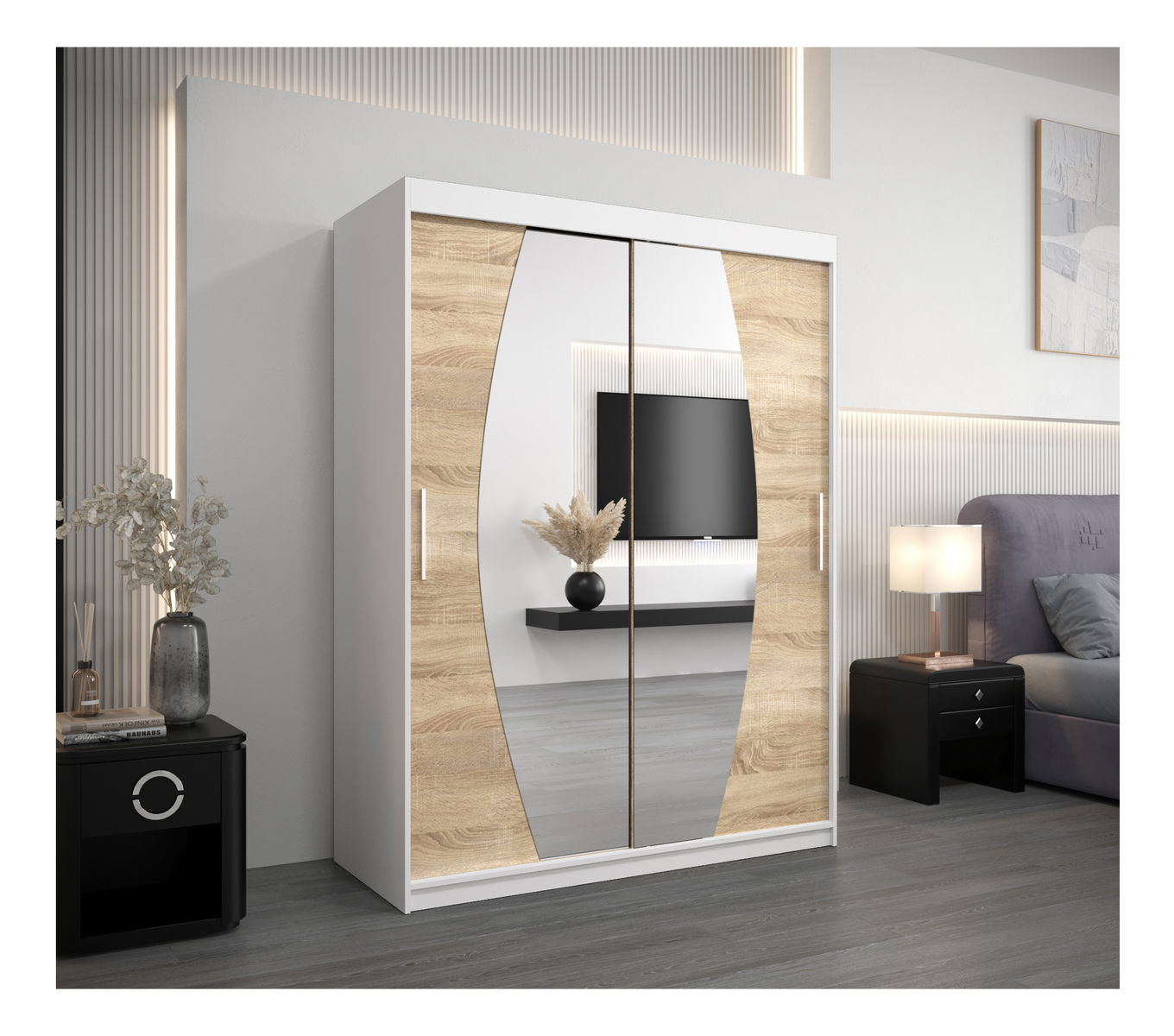 ZobraziťŠatníková skriňa Eclipse v bielom matnom a dubovom sonoma prevedení s výškou 200 cm, šírkou 150 cm a hĺbkou 62 cm je rozmerným úložným riešením pre vašu spálňu. Skriňa je vyrobená z pevnej 16 mm laminovanej dosky s ABS okrajmi hrúbky 0,5 mm, čo zvyšuje jej odolnosť. Zrkadlové dvere nielenže opticky rozšíria priestor, ale aj pridávajú skrini eleganciu. Hladký pohyb dverí zabezpečuje posuvný systém LAGUNA so spolupracujúcimi hliníkovými vodidlami. Strieborné plastové úchytky v podlhovastom dizajne dotvárajú moderný vzhľad skrine. Interiér skrine je rozdelený na 2 vešiakové tyče a 5 políc, ktoré sú prakticky rozmiestnené pre uskladnenie vašich vecí. Šatníková skriňa Eclipse je ohromujúca vo svojej veľkosti a poskytuje dostatok úložného priestoru pre vaše oblečenie a doplnky.