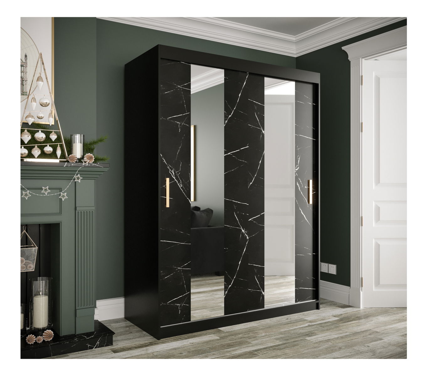 ZobraziťŠatníková skriňa Marbelo s posuvnými dverami je funkcionalitou a eleganciou zároveň. S výškou 200 cm, šírkou 150 cm a hĺbkou 62 cm, ponúka dostatok úložného priestoru na oblečenie, obuv a doplnky. Jej matná čierna a čierny mramorový povrch dodáva interiéru nádych luxusu a elegancie. S praktickými zrkadlovými posuvnými dverami a zlatými úchytmi je tento kus nábytku nielen praktický, ale aj pútavý. Univerzálny dizajn sa hodí do rôznych štýlov izieb a je dokonalým doplnkom pre organizáciu vašej spálne. Šatníková skriňa Marbelo je dokonalým riešením pre všetkých, ktorí hľadajú kombináciu praktickosti a elegance vo svojom interiéri.