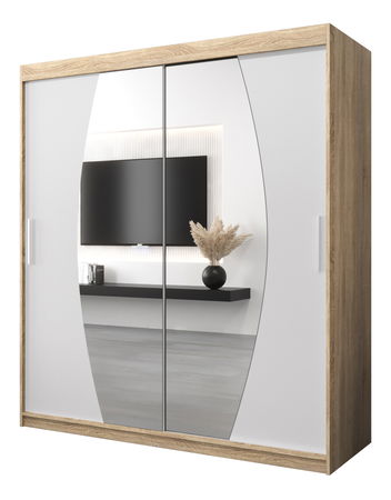 ZobraziťTáto moderná šatníková skriňa Eclipse s posuvnými dverami má šírku 180 cm, výšku 200 cm a hĺbku 62 cm. Je vyrobená z vysokokvalitnej 16 mm laminovanej dosky a má ABS hrany hrúbky 0,5 mm, čo zaručuje jej odolnosť. Na dverách sa nachádza praktické zrkadlo. Dvere sa pohybujú pomocou spoľahlivého posuvného systému LAGUNA na hliníkových vodidlách. Strieborné podlhovasté úchytky z plastu vytvárajú elegantný vzhľad nábytku. Vo vnútri skrine sú 2 vešiakové tyče a 5 multifunkčných políc, ktoré umožňujú uskladnenie odevov a ďalších vecí. Šatníková skriňa Eclipse je k dispozícii v dub sonoma + biela matná farbe.