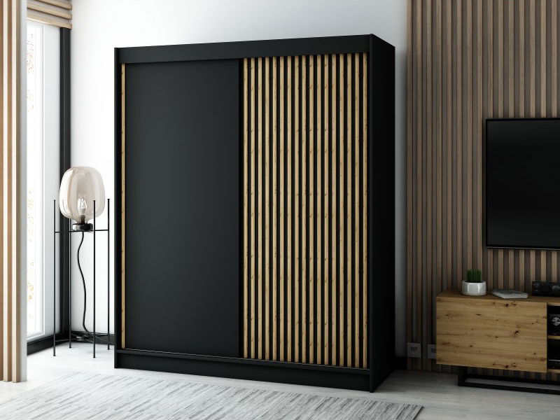 Šatníková skriňa Ladonna s výškou 200 cm, šírkou 180 cm a hĺbkou 62 cm v čiernom matnom prevedení je vyrobená z laminovanej dosky hrúbky 16 mm s PVC dyhou o hrúbke 0,5 cm. Dvere sú posuvné - jedny sú matného prevedenia, druhé majú dizajnové lamely o hrúbke 2 mm. Skriňa má bezúchytkový systém otvárania a hliníkové vedenie. Posuvný systém je od značky BIMAK. Táto moderná šatníková skriňa bez rukoväte sa hodí do mladistvých a moderných interiérov. Šatník neobsahuje zrkadlo, ale zásuvky sú voliteľným príslušenstvom, ktoré je možné zakúpiť na našom e-shope. Všetky potrebné súčiastky a montážny návod sú súčasťou balenia, ktoré sa skladá z piatich balíkov.