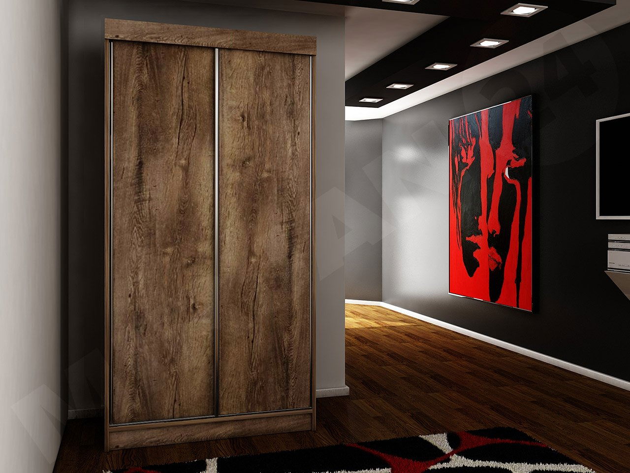 laminovaná drevotrieska 16 mm, okraje zakončené PVC dyhou, systém posuvných dverí - hliníkové ložiská, hrany dverí zakončené hliníkovými úchytkami, ktoré zabraňujú prehýbaniu dverí, vysoko kvalitné armatúry, bar a police vo vnútri, LED osvetlenie ako doplnková možnosť (vo verzii RGB je súčasťou balenia diaľkové ovládanie)