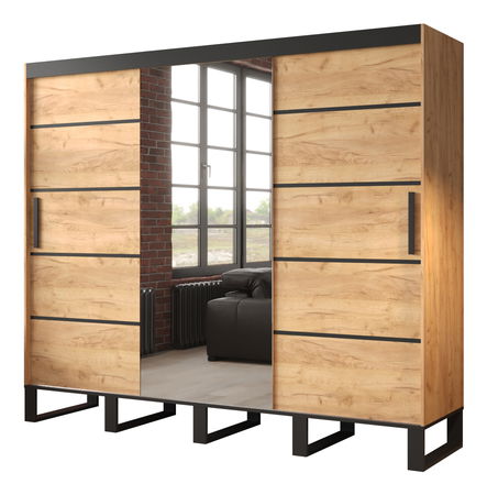 Šatníková skriňa Lennox s rozmermi 212 cm výška, 250,5 cm šírka a 62 cm hĺbka, v dub craft zlatej farbe a čiernej farbe, ponúka moderný vzhľad a šarm industriálneho štýlu. Táto skriňa je vyrobená z kvalitnej 16 mm laminovanej dosky s ABS hranami o hrúbke 0,5 mm zabezpečujúcimi dlhú životnosť. Čierny kovový rám skrine s výškou 10 cm zvyšuje jej stabilitu. Skriňa má troje posuvné dvere s čiernymi podlhovastými drevenými úchytkami, ktoré sú vybavené zrkadlami pre vizuálne zväčšenie priestoru. Skriňa má dve vešiakové tyče a deväť políc, ktoré poskytujú dostatok úložného priestoru pre všetky vaše odevy a osobné veci. Hliníkové vodidlá a posuvný systém BIMAK zabezpečujú plynulé a tiché otváranie a zatváranie dverí. Šatníková skriňa Lennox je vynikajúcim doplnkom pre každú modernú domácnosť.