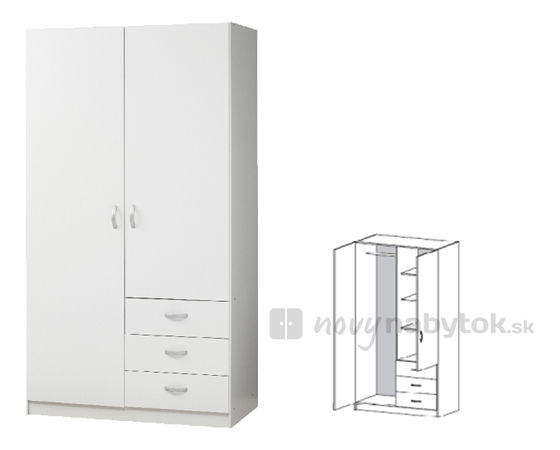 Dvojdielna šatníková skriňa má jednoduchý, moderný a čistý dizajn. Hodí sa do predsiení a spální. Poskytne vám dostatok úložného priestoru pre vaše oblečenie a doplnky. V ľavej časti skrine sa nachádza vešiaková tyč a v pravej časti sa nachádzajú poličky a tri zásuvky. Je v elegantnom bielom prevedení.