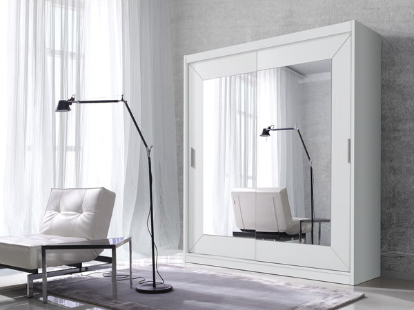 Šatníková skriňa, ktorá uspokojí aj náročnejších užívateľov. Na posuvných dverách sa nachádza zrkadlo, ktoré opticky zväčší priestor. Vnútorné usporiadanie je veľmi praktické. Nachádza sa tam vešiaková tyč na zavesenie oblečenia a výškovo nastaviteľné police, ktoré si môžete usporiadať podľa svojich potrieb. Je vyrobená z kvalitnej LTD (laminovaná drevotrieska) hrúbky 15 mm. Vďaka laminátovej vrstve je odolná voči vode a mechanickému poškodeniu.