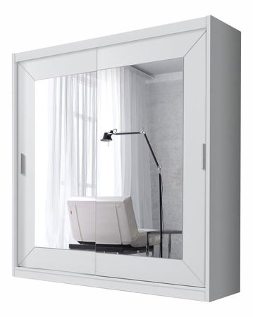 Šatníková skriňa, ktorá uspokojí aj náročnejších užívateľov. Na posuvných dverách sa nachádza zrkadlo, ktoré opticky zväčší priestor. Vnútorné usporiadanie je veľmi praktické. Nachádza sa tam vešiaková tyč na zavesenie oblečenia a výškovo nastaviteľné police, ktoré si môžete usporiadať podľa svojich potrieb. Je vyrobená z kvalitnej LTD (laminovaná drevotrieska) hrúbky 15 mm. Vďaka laminátovej vrstve je odolná voči vode a mechanickému poškodeniu.