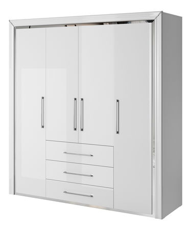 Táto veľká šatníková skriňa je ideálnym riešením pre tých, ktorí potrebujú maximálny úložný priestor s moderným dizajnom. Vyrobená z odolnej laminovanej drevotriesky s ABS hranami, ponúka trvácnosť a ochranu pred opotrebovaním. Skriňa má štyri dvere s vysokokvalitnou fóliou, ktorá dodáva povrchu elegantný vzhľad a ľahkú údržbu. Strieborné kovové rukoväte a olemovanie pridávajú na sofistikovanom vzhľade. Vnútorný priestor je dobre rozvrhnutý s dvomi vešiakovými tyčami pre oblečenie, piatimi priestrannými policami a tromi zásuvkami, ktoré poskytujú dostatok miesta na uskladnenie oblečenia a doplnkov. Táto šatníková skriňa je skvelou voľbou pre organizovaný a štýlový domov