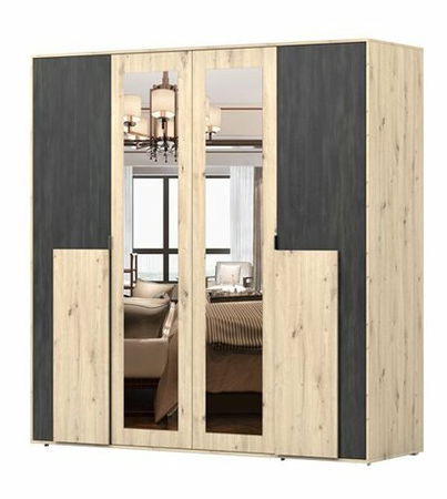 Moderná šatníková skriňa Šatníková skriňa - Barca (dub artisan + borovica nórska čierna) s výškou 203 cm, šírkou 200 cm a hĺbkou 65 cm ponúka bohatý úložný priestor a dizajn, ktorý skvele zapadne do súčasného interiéru. Jej konštrukcia zahrnuje vonkajšie aj vnútorné časti z 16 mm hrubej drevotriesky, zaisťujúce pevnosť a odolnosť. Skriňa má 0,5 mm hrubé ABS hrany, pridávajúce trvanlivosť a kvalitný vzhľad. Úchyty sú čierne a minimalistické, zvýrazňujúce moderný charakter skrine, a plastové nožičky poskytujú stabilnú podporu. Skriňa obsahuje zrkadlo, čo je praktický a žiadaný prvok, a má štyri dvere, umožňujúce ľahký prístup k obsahu skrine. Vnútri nájdete dve tyče na zavesenie odevov pozdĺžne umiestnené v strede a celkovo desať poličiek, z toho štyri na ľavej, štyri na pravej strane a dve v strede. Toto rozloženie poskytuje efektívne a organizované skladovanie odevov a iných predmetov. Táto šatníková skriňa je ideálna pre tých, ktorí hľadajú spojenie funkčnosti a súčasného dizajnu v jednom kuse nábytku.