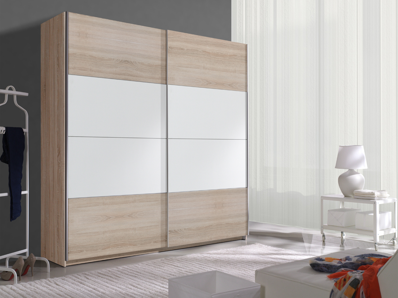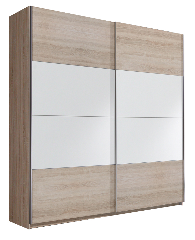 Priestranná šatníková skriňa s množstvom úložného priestoru. Mať poriadok v oblečení nebolo nikdy jednoduchšie. V pravej časti sa nachádzajú štyri poličky. Do časti ľavej si môžete na vešiakovú tyč zavesiť svoje oblečenie. Posuvné dvere šetria priestor, kedže sa neotvárajú do strany.