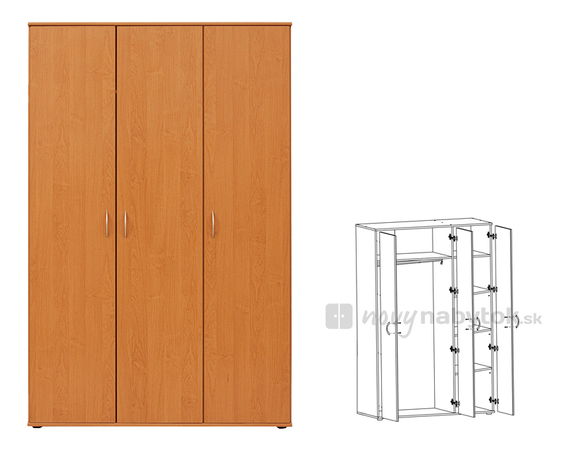 Priestranná šatníková skriňa s vešiakovou tyčou na uloženie vášho oblečenia a so štyrmi poličkami v pravej časti. Skriňa má jednoduchý dizajn a pekné farebné prevedenie. Úchyty na dvierkach a zásuvkách sú širšie a zaoblené. Hodí sa do predsiení, spální, študentských izieb a pracovní.