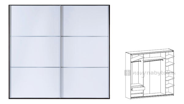 Široká šatníková skriňa s vodorovnými diajnovými linkami . Skriňa má posuvné dvere a má nielen vešiakovú tyč na oblečenie, ale aj päť užitočných poličiek v pravej časti skrine. O úložný priestor teda nebudete mať núdzu.