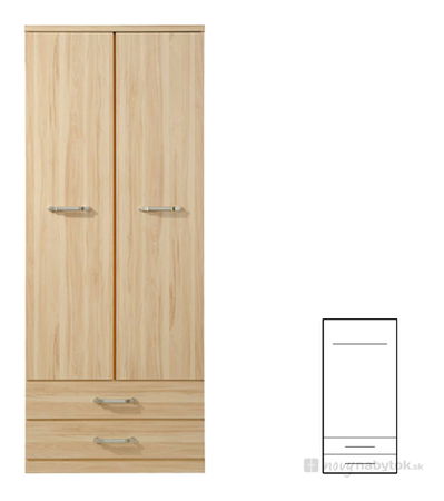 Šatníková skriňa jednoduchého dizajnu vhodná na zariadenie študentských alebo detských izieb. Má dvoje dvierka a dve zásuvky v spodnej časti. Do skrine si umiestnite oblečenie a rôzne doplnky. Zaujímavé sú kovové úchyty na dvierkach a zásuvkách.