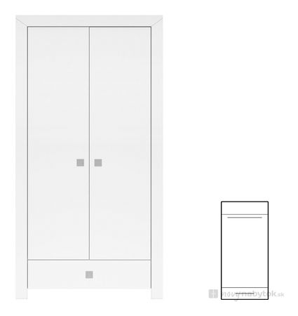 Praktická 2-dverová šatníková skriňa obsahuje tyč na zavesenie šiat a 1 zásuvku. Zásuvka je na valčekových koľajničkách. Dostupná v dvoch farebných prevedeniach: biela a lesk biely.