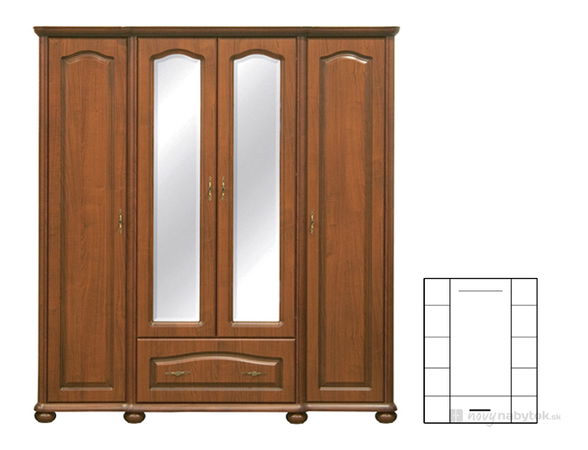 Šatníková skriňa Natalia SZF s výškou 190 cm, hĺbkou 63 cm a v farbe Višňa Primavera je dokonalým doplnkom do každej spálne. S jej rustikálnym dizajnom a vyrezávanými ozdobnými dvierkami a zásuvkou bude naozajstným skvostom. Skriňa je vybavená praktickým zrkadlom uprostred a ozdobnými úchytkami na zásuvke a dvierkach. Stojí na hrubých a guľatých nožičkách, čo dodáva jej charakteristický vzhľad. Sektorový nábytok Natalia je navrhnutý s dôrazom na detaily, vrátane vyrezávaných líšt, kovaných úchytkov a masívnejších nožičiek. Modelový rad Natalia v rustikálnom štýle vytvára osobitú atmosféru v interiéroch a je dokonalou voľbou pre tých, ktorí preferujú prírodné materiály a retro prvky v dizajne.